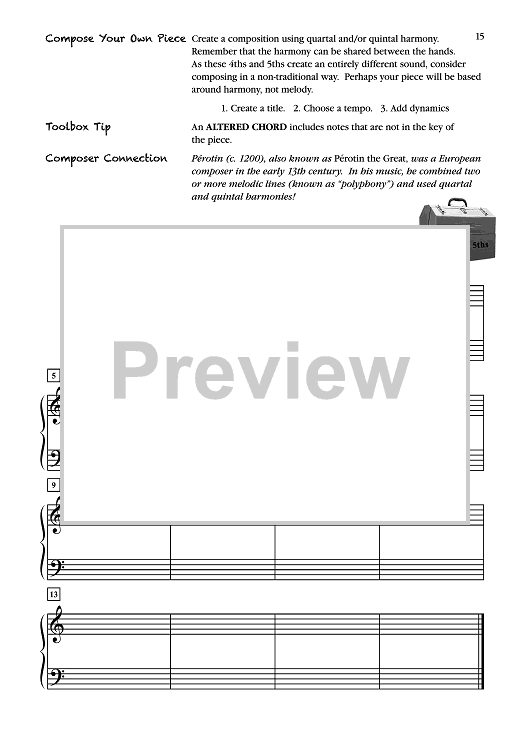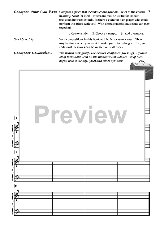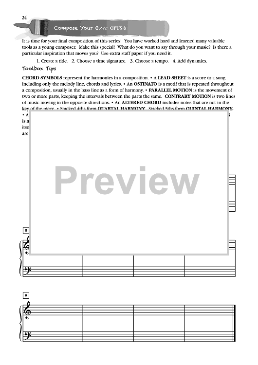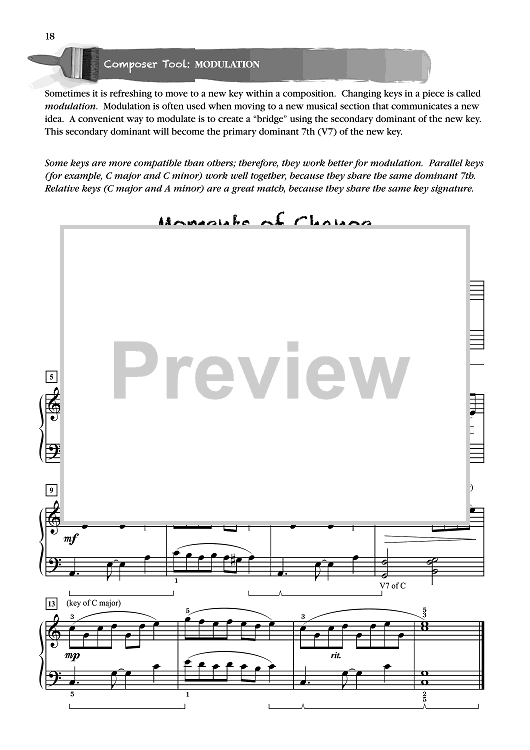 This late intermediate book introduces students to the art of original composition. It features the following composition tools: chord symbols, lead sheets, ostinato, parallel and contrary motion, altered chords, quartal and quintal harmony, secondary dominants, modulation, canon, and counterpoint.