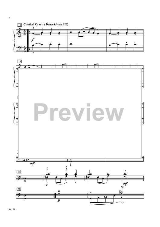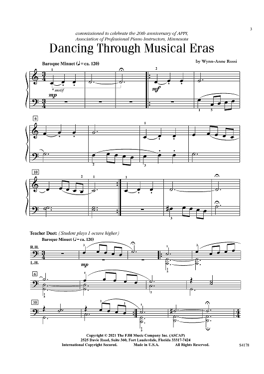 Commissioned to celebrate the 20th anniversary of the Association of Professional Piano Instructors (APPI), Minnesota, this sheet has four short sections that represent the musical eras. Each “movement” flows easily to the next being only 10-14 measures in length. As a teaching opportunity, students are introduced to the concept of a motif stated in the opening of the Baroque Minuet. The composer encourages the student to find this motif throughout the piece - 20 times! The other movements are called: Classical Country Dance; Romantic Valse Triste and Jazz Boogie. All have optional teacher duets.