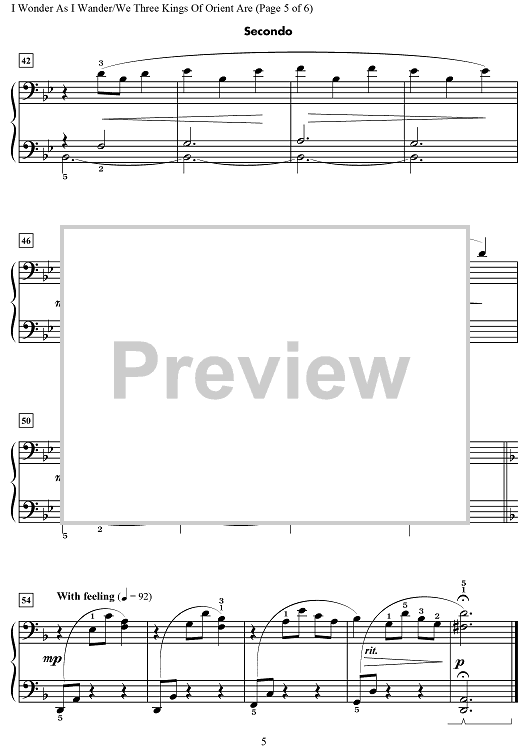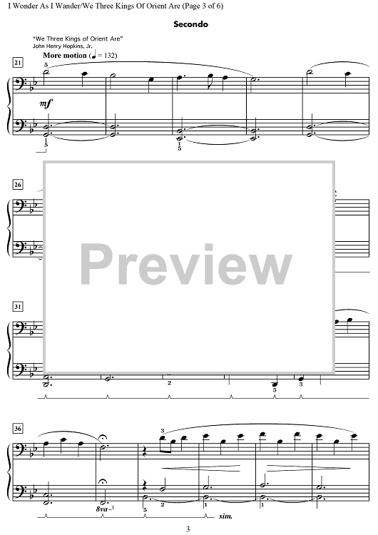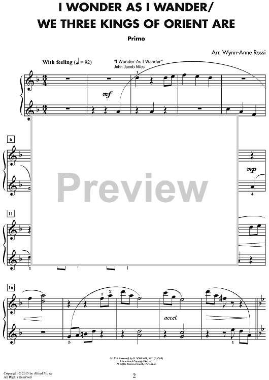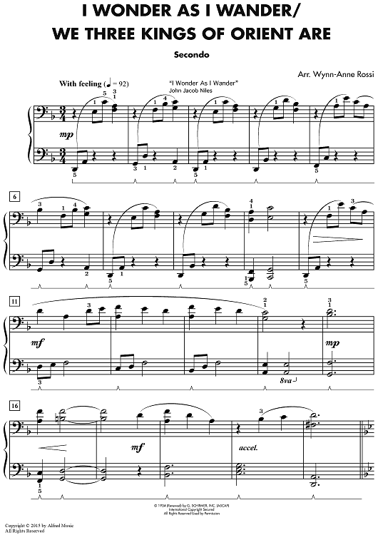 Digital Sheet Music for I Wonder As I Wander / We Three Kings of Orient Are by John Jacob Niles, Wynn-Anne Rossi, John Henry Hopkins, Jr. scored for 1 Piano, 4 Hands; id:469710