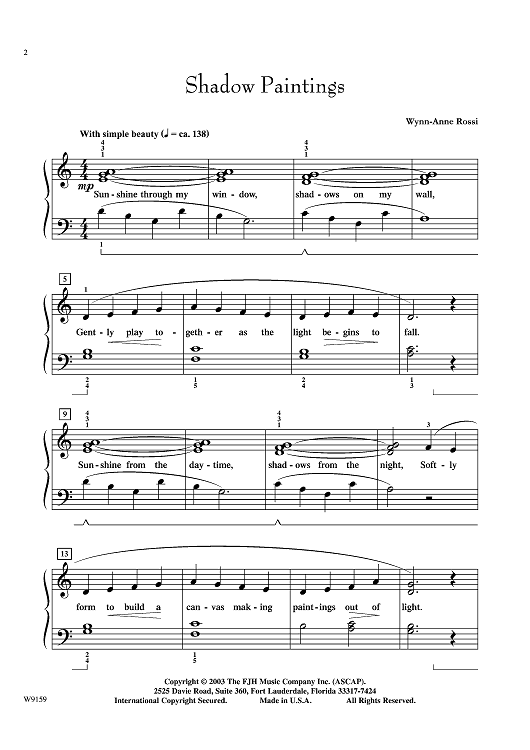An expressive piece your students will truly enjoy playing, Shadow Paintings features both right-hand and left-hand melody, legato pedal, major 6th chords, and beautiful lyrics.