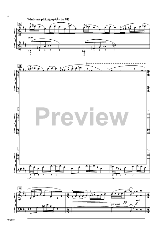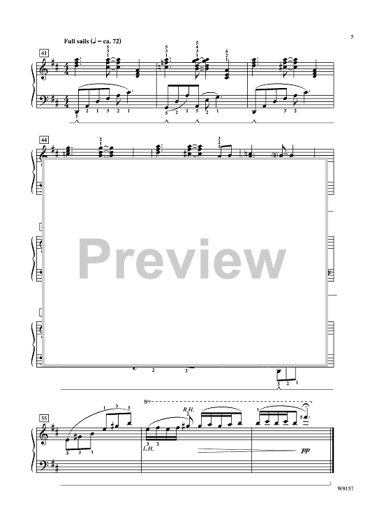 With a gentle, breezy introduction, this piece sets out to sea, navigating by starlight! New age rhythms and harmonies journey through the lively waves, becoming ever more familiar. Chordal in the right hand; the left keeping the tidal motion continuous. Lots of spontaneous flowing passages as the winds pick up, until finally we are at full sail with the return of the original themes. Students will enjoy bringing this wonderfully lush, contemporary piece to life!