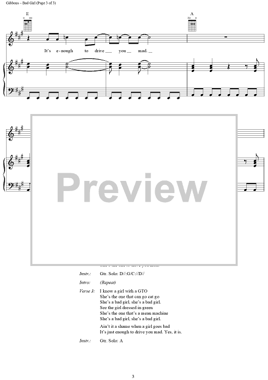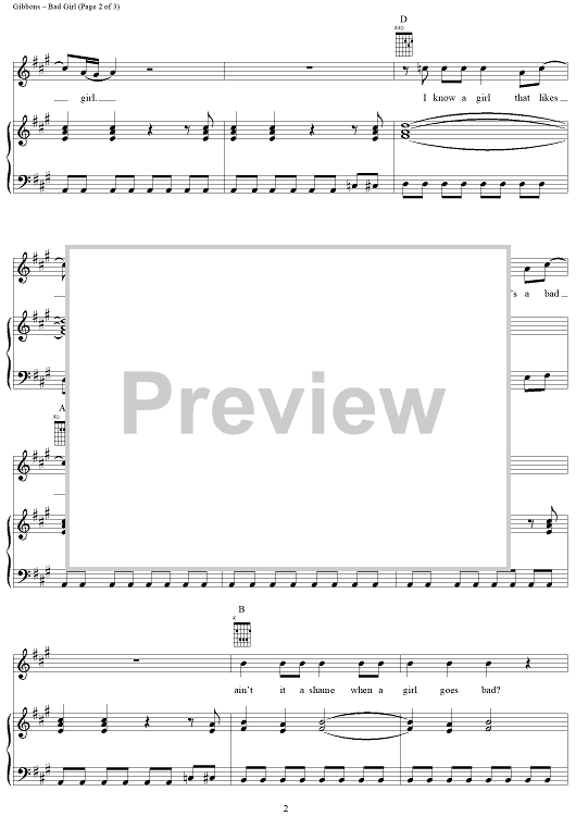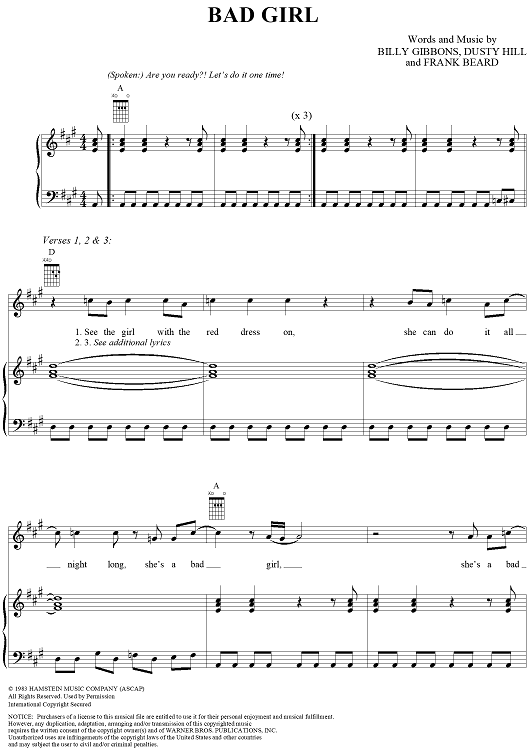 Digital Sheet Music for Bad Girl by Billy Gibbons, Dusty Hill, Frank Beard, ZZ Top scored for Piano/Vocal/Chords; id:268203