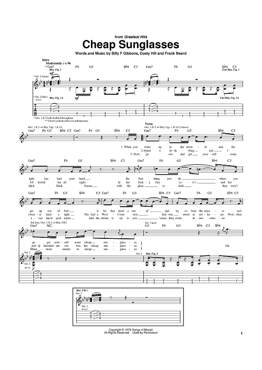 Digital Sheet Music for Cheap Sunglasses by Billy Gibbons, Dusty Hill, Frank Beard, ZZ Top scored for Guitar Tab; id:370728
