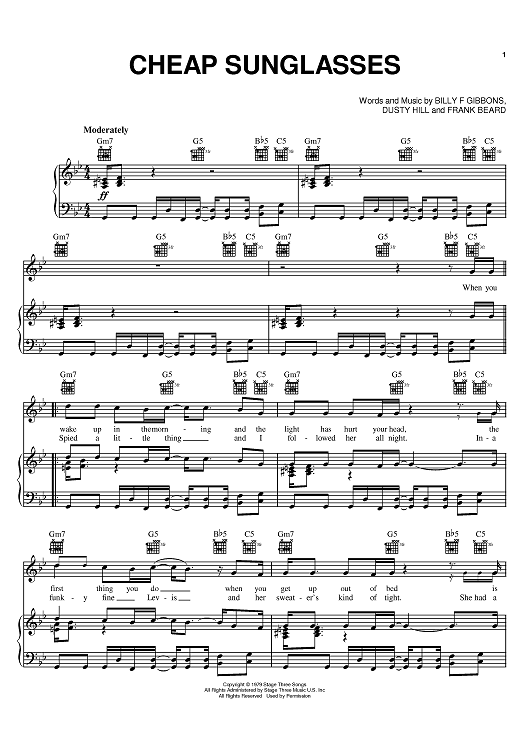 Digital Sheet Music for Cheap Sunglasses by Billy Gibbons, Dusty Hill, Frank Beard, ZZ Top scored for Piano/Vocal/Chords; id:371032