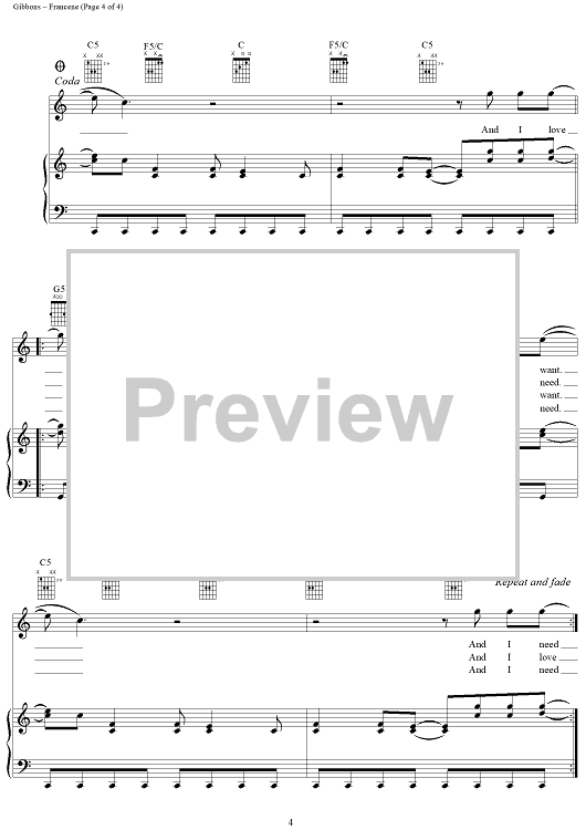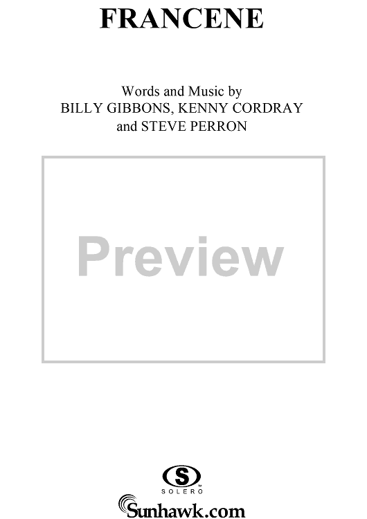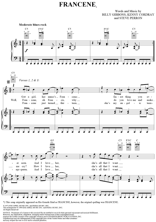 Digital Sheet Music for Francene by Billy Gibbons, Kenny Cordray, Steve Perron, ZZ Top scored for Piano/Vocal/Chords; id:268509
