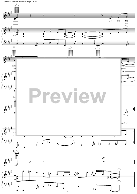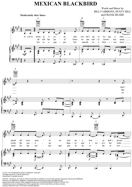 Digital Sheet Music for Mexican Blackbird by Billy Gibbons, Dusty Hill, Frank Beard, ZZ Top scored for Piano/Vocal/Chords; id:202239