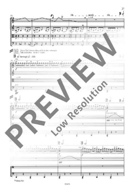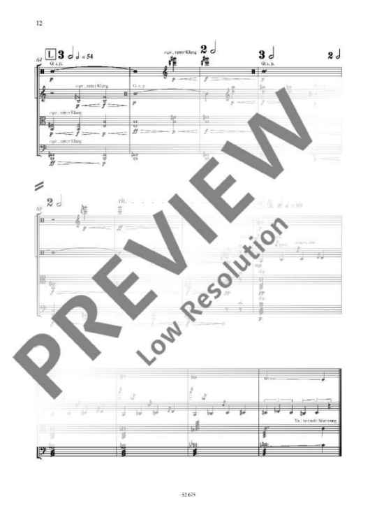 This string quartet by a grand master of the German avant-garde combines a decidedly traditional four-movement structure with experimental situations in the concert hall. In various sections the performers act on revolving stools, in others they take positions at the edge and in the corners of the platform or around the listeners. However, the composer also allows a performance in a conventional seating arrangement which emphasizes the work's classical nature with regard to material and form even further.