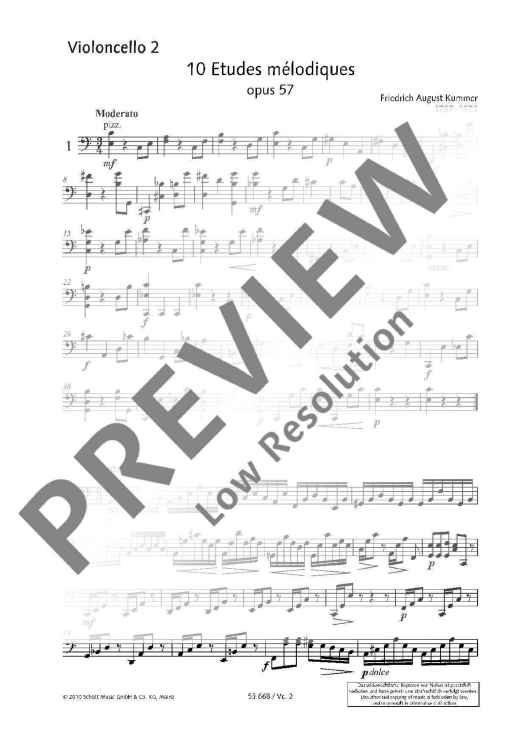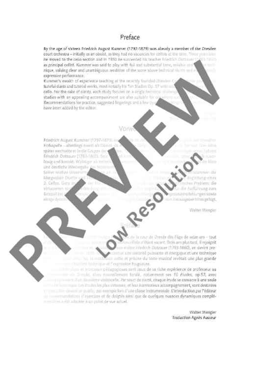 At the age of 16, Friedrich August Kummer (1797-1879) was already a cellist for the Dresden Court Chapel where he was known particularly for his reliable technique and strong tone. As a teacher at the conservatoire, he composed numerous works for teaching purposes, cello duets and studies. Thanks to his rich experience in teaching and his structured teaching method, his study works are highly topical even today. Each of the 10 Etudes mélodiques deals with a particular technical issue. To make practising as varied and effective as possible, the studies come with preliminary technical exercises, tips on practising and practising variants. Apart from the technical aspects, the pleasure of music-making gets its fair share too: Each study can also be played as a duet. A valuable study work for the successful development of the player's technique, with tips on studying by the well-known cello teacher Walter Mengler.