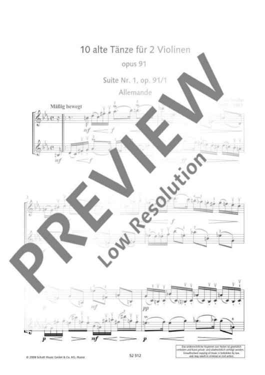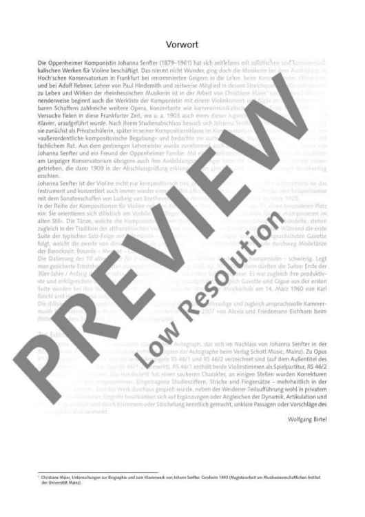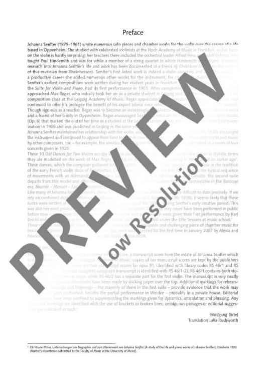The composer and violinist Johanna Senfter from Oppenheim wrote concert works, such as chamber music works for violin, her whole life. Being a pupil of Reger, who held her in high esteem, she composed 10 alte Tänze für 2 Violinen, Op. 91, which follow the style of Max Reger and even share his preference for 'composing in the old style'. The dances, which were combined by the composer to form two suites, are influenced by the tradition of the old French violin duos by Boismortier, Corrette or Leclair. This demanding chamber music is fun to play and suitable for both lessons and concerts.