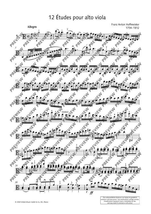 As a music publisher in Vienna, Franz Anton Hoffmeister secured an important place in music history. But he was also an extremely prolific and valued composer of Viennese Classic. His 12 Studies for viola offer a compendium of playing techniques from the Mozart/Beethoven era, with scales, triads and position playing, double stops, arpeggios, as well as cantabile and polyphonic playing.