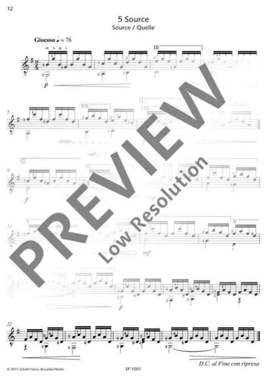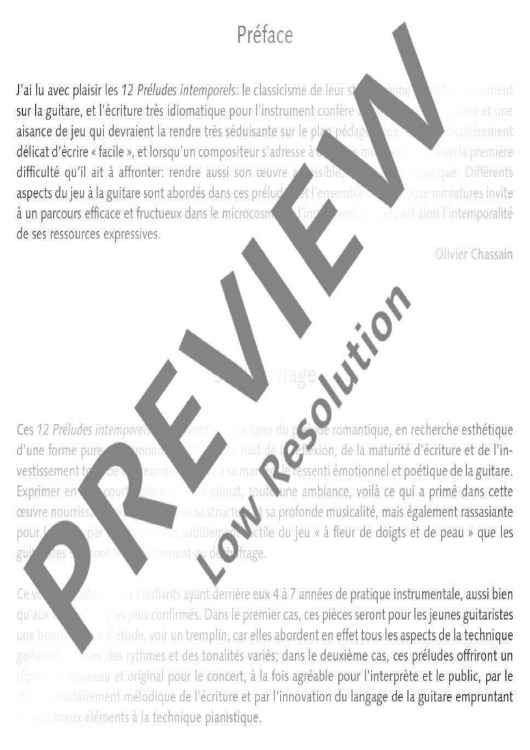 With his miniatures 12 préludes intemporels, Olivier Mayran de Chamisso expresses a classical style of its own which is tonally and musically convincing due to its delicate simplicity. As to style, "12 Timeless Preludes" is in the tradition of Romanticism and invite the musician on a journey into the microcosm of the classical guitar: Each piece expresses a certain atmosphere. Each miniature, from 'Flight' via 'Longing' to 'Memory', is a character piece full of musical intensity. With the pieces, Chamisso also pursued educational goals, dealing with numerous technical aspects of guitar playing in his miniatures. The present edition is aimed at advanced players and experienced instrumentalists who wish to expand their original concert repertoire.