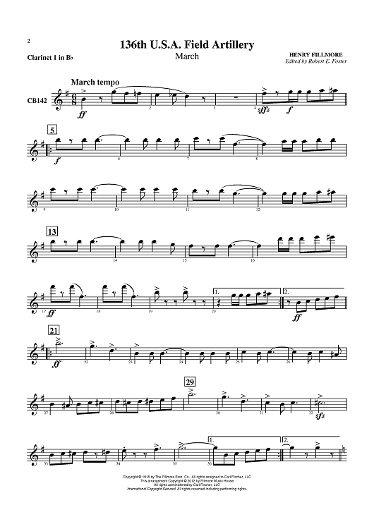 Digital Sheet Music for 136th U.S.A. Field Artillery (March) - Clarinet 1 in Bb by Henry Fillmore, Robert E. Foster scored for Concert Band; id:430427