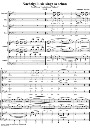Digital Sheet Music for 15. Nachtigall, sie singt so schön by Johannes Brahms scored for SATB Chorus/2 Pianos, 4 Hands; id:274329