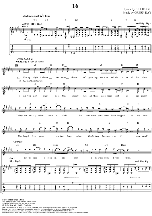 Digital Sheet Music for 16 by Green Day, Billie Joe scored for Guitar Tab/Vocal; id:271029