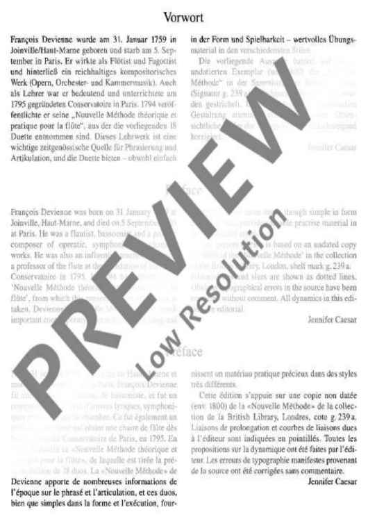 François Devienne wirkte als Flötist und Fagottist und hinterließ ein reichhaltiges kompositorisches Werk (Opern, Orchester- und Kammermusik). Auch als Lehrer war er bedeutend und unterrichtete am 1795 gegründeten Conservatoire in Paris. 1794 veröffentlichte er seine "Nouvelle Méthode théorique et pratique pour la flûte", aus der die 18 Duette entnommen sind. Dieses Lehrwerk ist eine wichtige zeitgenössische Quelle für Phrasierung und Artikulation, und die Duette bieten - obwohl einfach in der Form und Spielbarkeit - wertvolles Übungsmaterial in den verschiedensten Stilen. Die vorliegende Ausgabe basiert auf einem undatierten Exemplar (um 1800) der "Nouvelle Méthode" in der Sammlung der British Library, (Signatur g. 239 a).