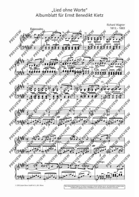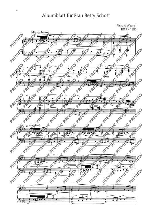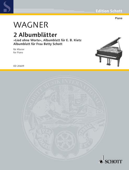 It is not widely known that Wagner was a piano composer too. This is why three piano works from the anthology 'Klavierwerke' (Schott ED 7700) have now been published as single editions which are sure to find their way into the repertoire of pianists. The two album leafs are dedicated to important people in Wagner's life. Albumblatt für Ernst Benedikt Kietz, is about a close friend of Wagner and was written during his first visit to Paris. Albumblatt für Frau Betty Schott is a token of gratitude to the patroness and widow of the music publisher Franz Schott from Mainz. It contains, albeit hidden, reminiscences of motifs from the 'Mastersingers'. This lovely character piece is also Wagner's last work for piano.