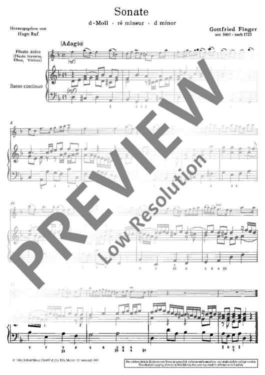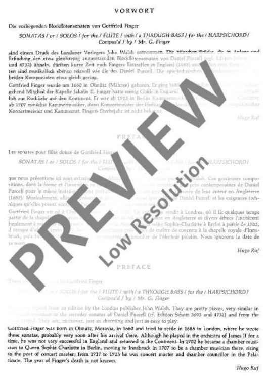 These recorder sonatas by Gottfried Finger have been copied from an edition by the London publisher John Walsh. They are pretty pieces, very similar in form and invention to the recorder sonatas of Daniel Purcell (cf. ED 3693 and 4732) and from the same period. They are, moreover, just as charming and just as easy to play.
