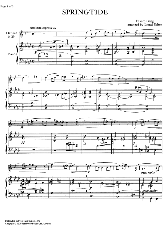 Digital Sheet Music for 2 Elegische Melodien Op.34 No. 2 - Letzter Frühling (Vaaren - Last Spring) by Edvard Grieg, Lionel Salter scored for Clarinet/Piano; id:332663