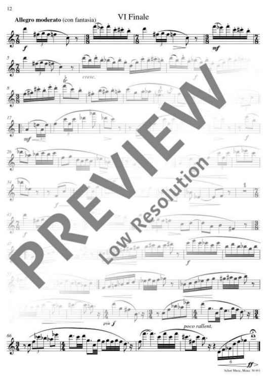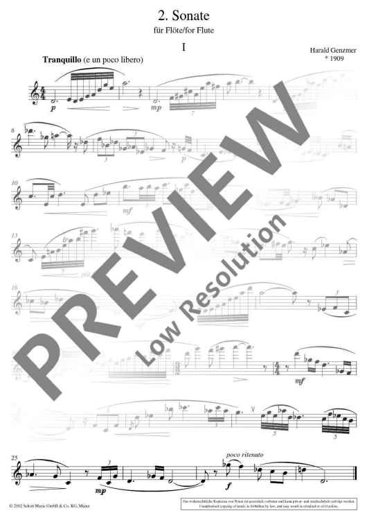 Harald Genzmer composed this Flute Sonata at the suggestion of Dr Peter Hanser-Strecker, Chairman of Schott Music. On 7 November 1999 Genzmer sent it to SMI with the words: "I enclose an entirely new sonata for the flute. I have been careful to avoid the problematic areas for the flute: there are no harmonics, no very high or low notes, and so on. I have really enjoyed working on it, and make no secret of the fact that I am very fond of the piece." A rewarding piece for playing in concerts and competitions; well suited to the instrument and imaginatively composed.