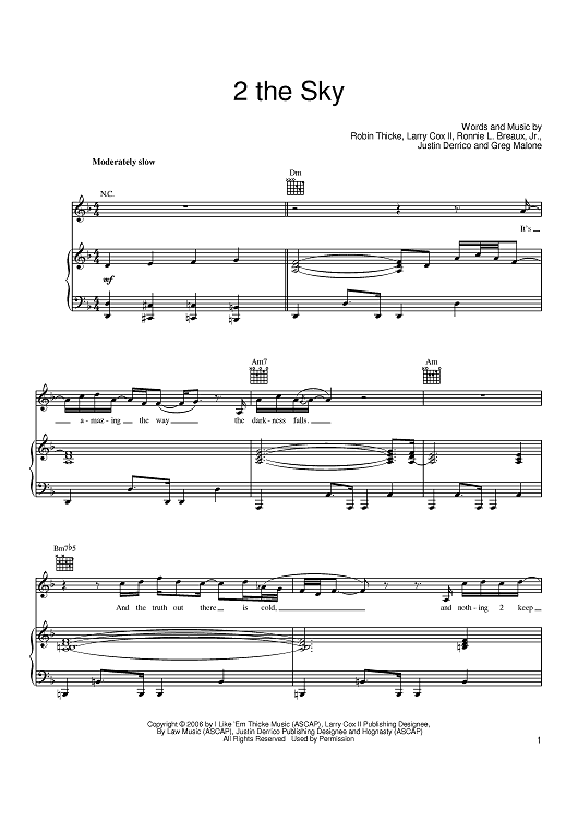 Digital Sheet Music for 2 The Sky by Ronnie L. Breaux, Jr., Larry Cox II, Justin Derrico, Greg Malone, Robin Thicke scored for Piano/Vocal/Chords; id:401833