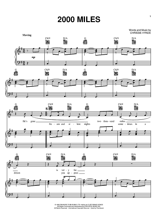 Digital Sheet Music for 2000 Miles by The Pretenders, Chrissie Hynde scored for Piano/Vocal/Chords; id:393698