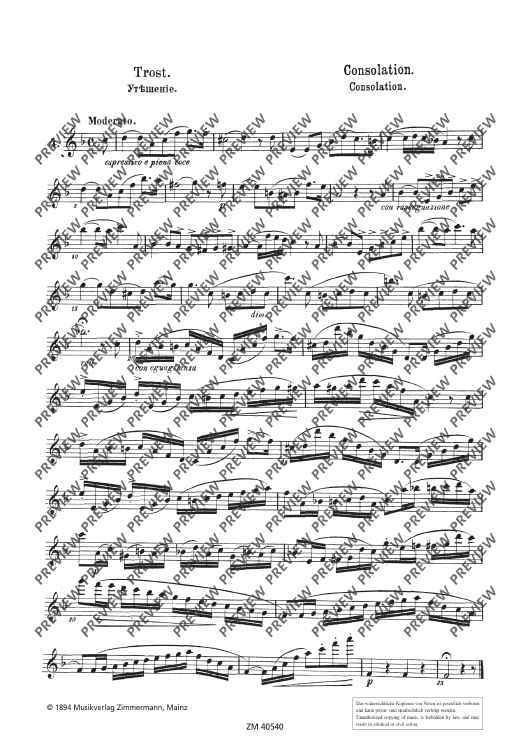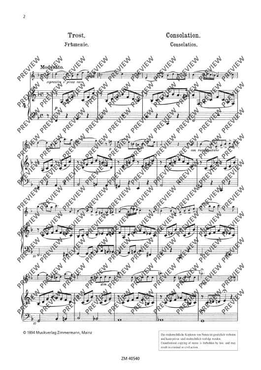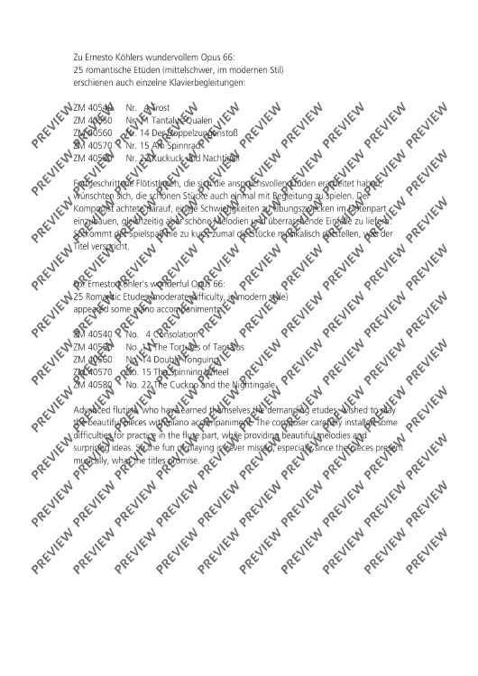 Zu Ernesto Köhlers wundervollem Opus 66, 25 romantische Etüden(mittelschwer, im modernen Stil) erschienen auch einzelne Klavierbegleitungen: ZZM 40540 Nr. 4 Trost ZZM 40550 Nr. 11 Tantalus-Qualen ZZM 40560 Nr. 14 Der Doppelzungenstoß ZZM 40570 Nr. 15 Am Spinnrad ZZM 40580 Nr. 22 Kuckuck und Nachtigall Fortgeschrittene Flötisten/innen, die sich die anspruchsvollen Etüden erarbeitet haben, wünschten sich, die schönen Stücke auch einmal mit Begleitung zu spielen. Der Komponist achtete darauf, einige Schwierigkeiten zu Übungszwecken im Flötenpart einzubauen, gleichzeitig aber schöne Melodien und überraschende Einfälle zu liefern. So kommt der Spielspaß nie zu kurz, zumal die Stücke musikalisch darstellen, was der Titel verspricht.