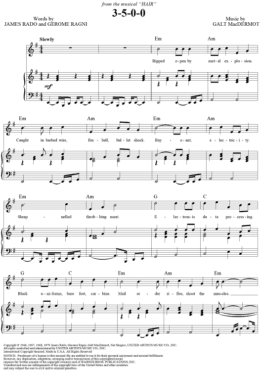 Digital Sheet Music for 3-5-0-0 by Galt MacDermot, James Rado, Gerome Ragni scored for Piano/Vocal/Chords; id:235812