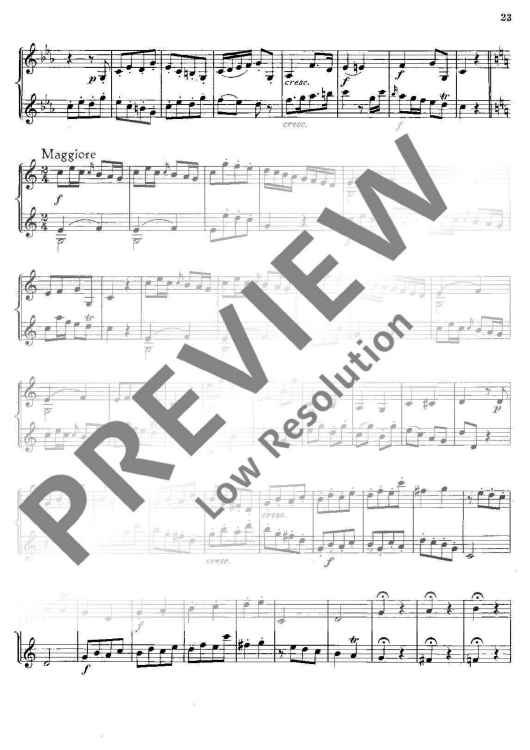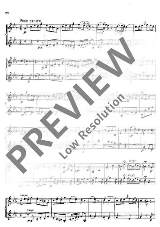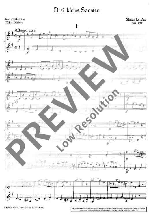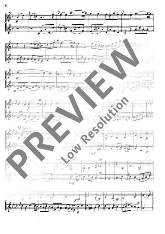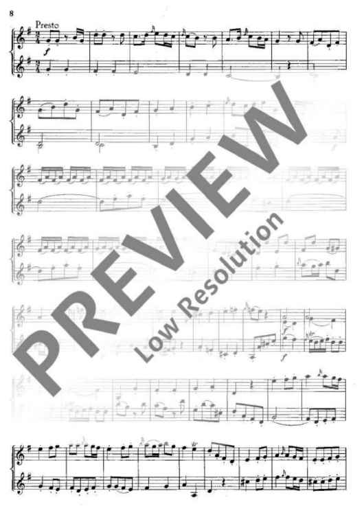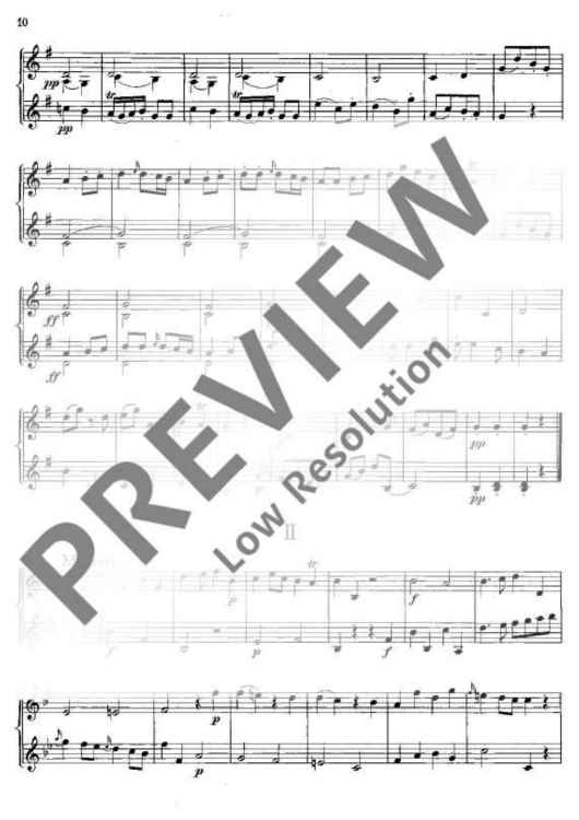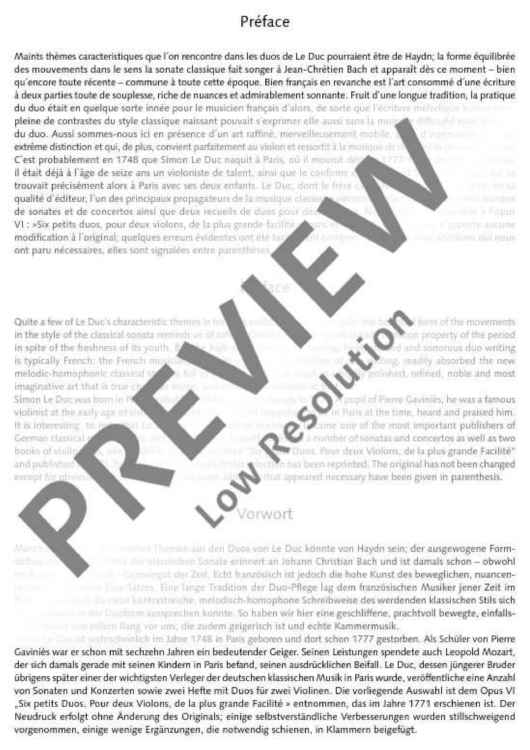Simon Le Duc (1742-1777) is one of the most important French orchestral composers of his time and was held in high esteem by his contemporaries. Leopold Mozart too showed respect for him in his travel notes. His opus VI, 'Six petits Duos pour deux violons de la plus grande facilité', was first published in 1771 by the publishing house of his brother Pierre. Many characteristic themes from the duos could have been written by Haydn, while the well-balanced formal structure of the movements is reminiscent of Johann Christian Bach. The music stands out due to the new contrasting, melodic, homophonic style of the classical idiom undergoing development. All in all, the way in which it compiles duos of imaginative art and its design for the violin in particular makes this collection ideal for lessons, auditions and amateur music-making.