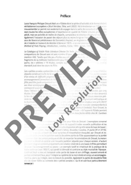 Louis Drouet (1792-1873), much admired virtuoso flautist, composer, musical director and opera director, was 'a flautist of truly European standing and sphere of influence'. His method still forms part of today's standard teaching repertoire. The 'Little Sonatas' published here for the first time as a separate new edition constitute the final part of Part 3 of his method. In accordance with the remarks of Drouet who had two different performance versions in mind, the sonatas are available in two instrumentations: for two flutes and for flute and piano. The piano accompaniment, with its figured bass realized by Gottfried Bach, has been turned into a harmonic accompaniment.
