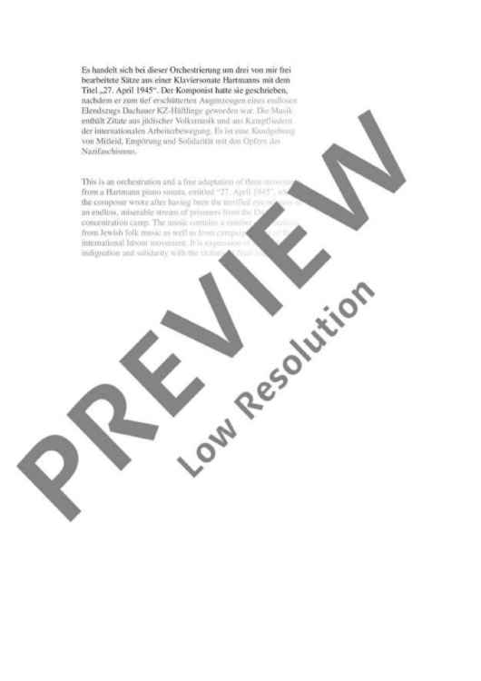 "These are free arrangements of three movements from Hartmann’s Piano Sonata ‘27. April 1945.’ Hartmann wrote the Sonata after witnessing endless columns of emaciated prisoners leaving the Dachau concentration camp. The music contains quotes from Jewish folk tunes and from revolutionary songs of the International Worker’s Movement. It is a declaration of pity and outrage and of solidarity with the victims of Nazi Fascism." (from: Hans Werner Henze, Ein Werkverzeichnis 1946-96 [ED 8579])
