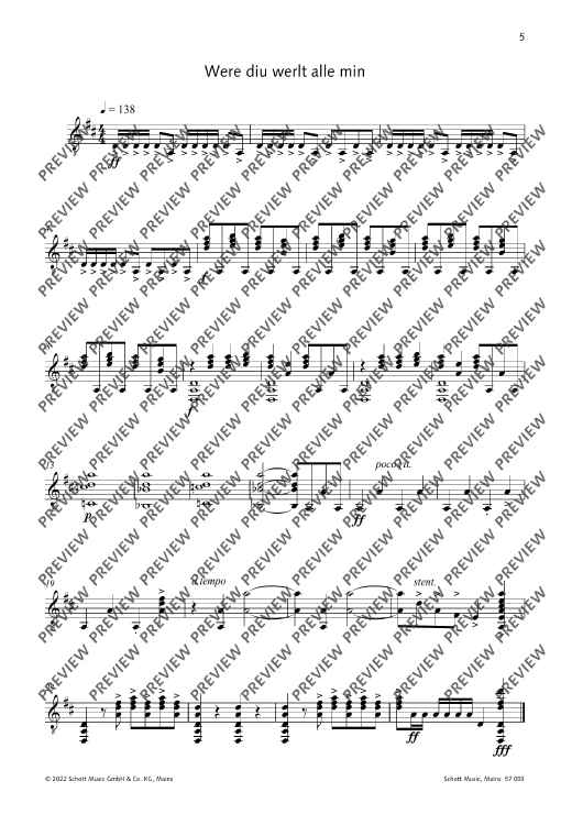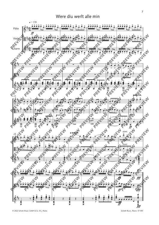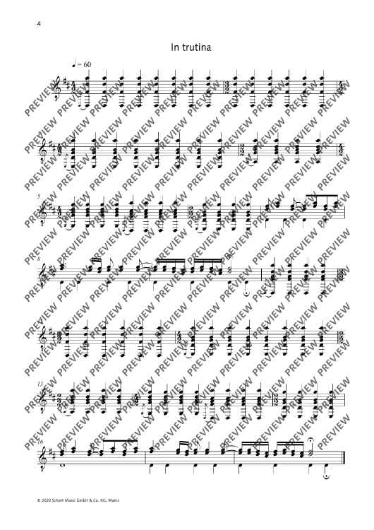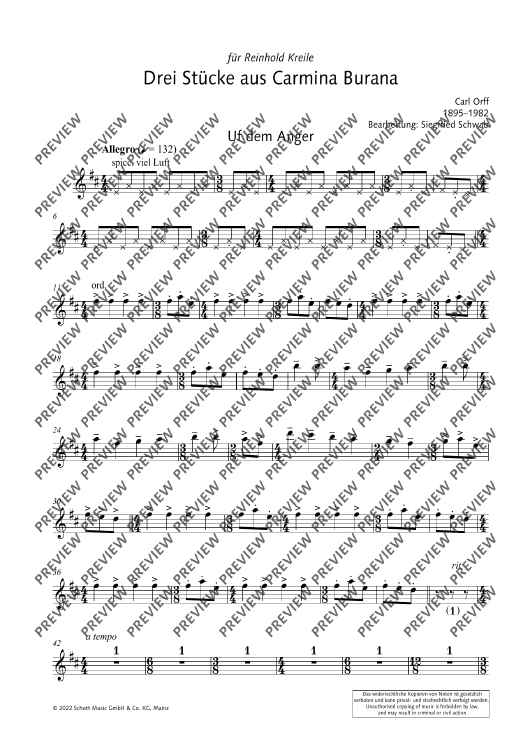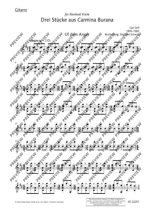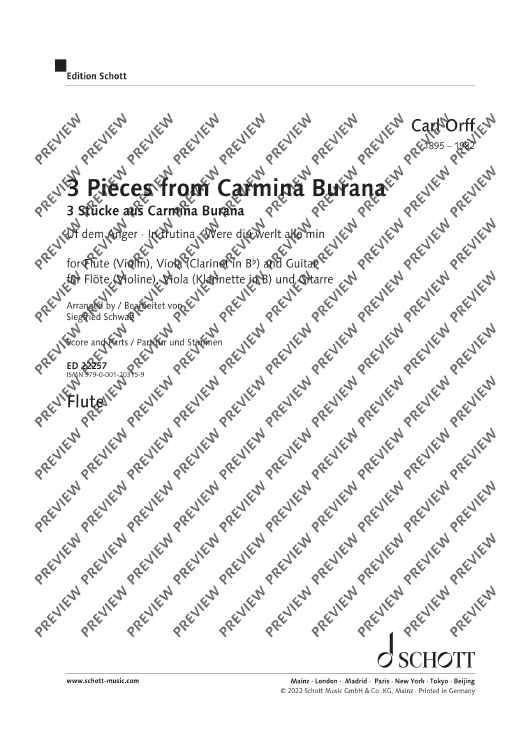 The well-known guitarist Sigi Schwab has created an almost intimate arrangement for guitar, flute (or violin) and viola (or clarinet) from three pieces of the large-scale Carmina Burana. The three pieces can be played directly one after the other like a three-movement work.