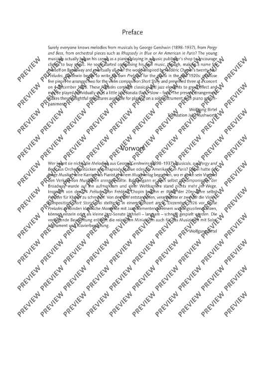 The melodies from George Gershwin's (1898-1937) musicals, from 'Porgy and Bess', from orchestral pieces like 'Rhapsody in Blue' or 'An American in Paris', we all know them! But the career of the young musician started as a pianist in a music publishing house where he was to encourage customers to buy music by playing it. Soon he began to compose music himself and caught the attention of the Broadway, which paved the way to his international career. Inspired by Frédéric Chopin's 24 Préludes, he began to write his own 'Preludes' for the piano in the mid-1920s: Of the five preludes composed by him, he used two for the violin composition 'Short Story' and presented the other three at a concert on 4 December 1926. These 'Preludes' combine classical moments and jazz elements into an effective whole and can be played individually or as a little jazz sonata (fast – slow – fast). Thanks to the present arrangement, the charming miniatures are now available in a version for solo instrument and piano accompaniment.