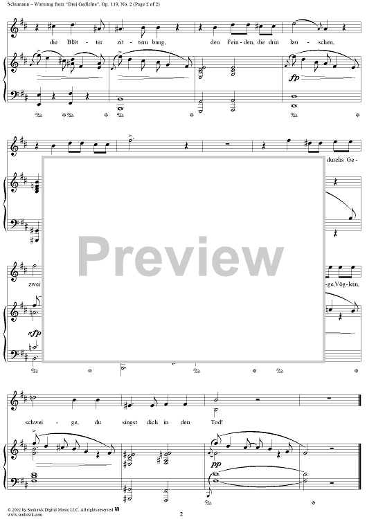 Digital Sheet Music for 3 Songs, Op. 119, No. 2 - Warnung - No. 2 from "Three Poems" op. 119 by Robert Schumann, S. Pfarrius scored for Voice/Piano; id:258255