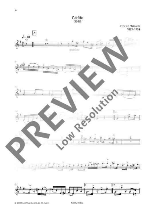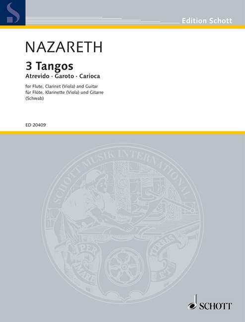 The compositions by the greatest Brazilian tango composer and pianist Ernesto Júlio de Nazareth (1863 -1934) are strongly influenced by Brazilian folk music. He preferred light entertainment, and his dance music has remained extremely popular in his home country until today. Heitor Villa-Lobos called him 'the true embodiment of the Brazilian soul'. Nazareth composed primarily choros music which is very common in Brazil, but it was his 25 tangos (25 Tangos Brasileiros for piano, Schott ED 7561) that made him famous. Three of these tangos have now been arranged for chamber music ensemble by Siegfried Schwab: Atrevido, Garoto and Carioca. With the slow Garoto being framed by the faster tangos Atrevido and Carioca, they are ideal for being performed as a cycle. The lively and characteristic tango rhythms are a valuable addition to any chamber music repertoire.