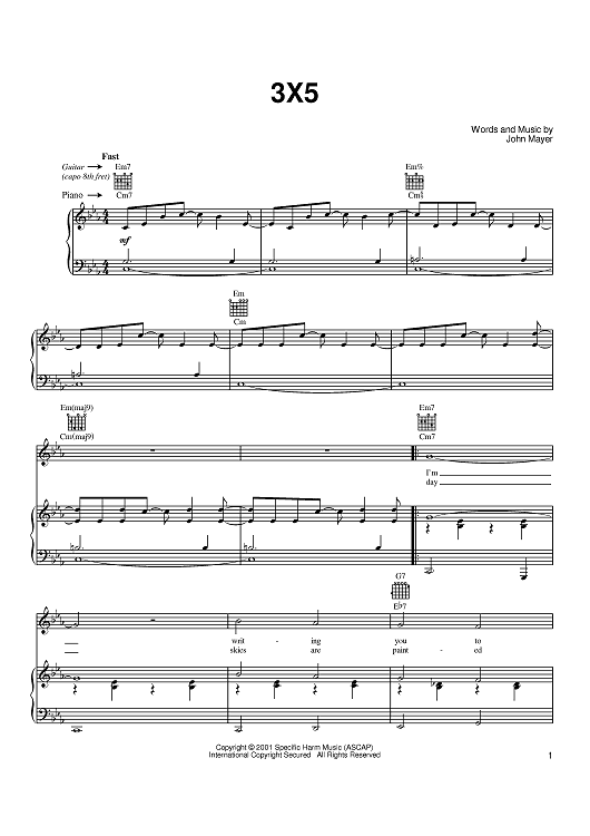 Digital Sheet Music for 3X5 by John Mayer scored for Piano/Vocal/Chords; id:371470