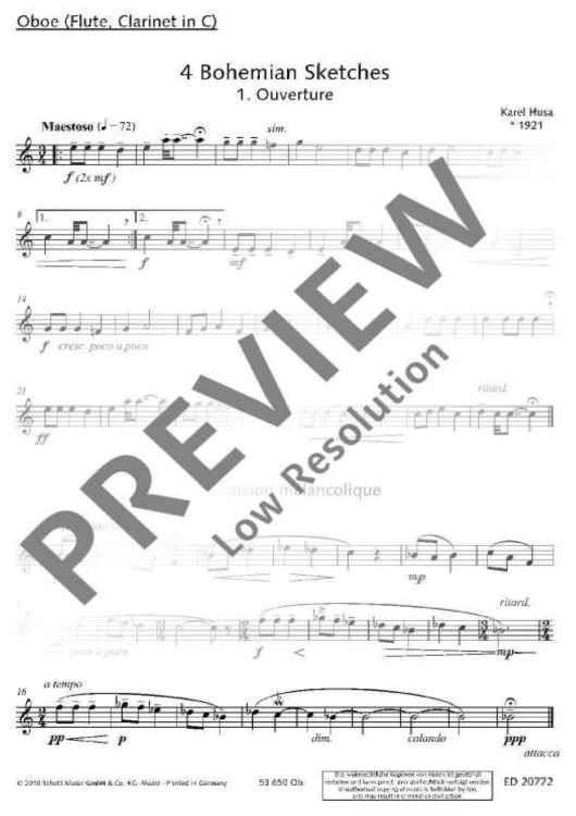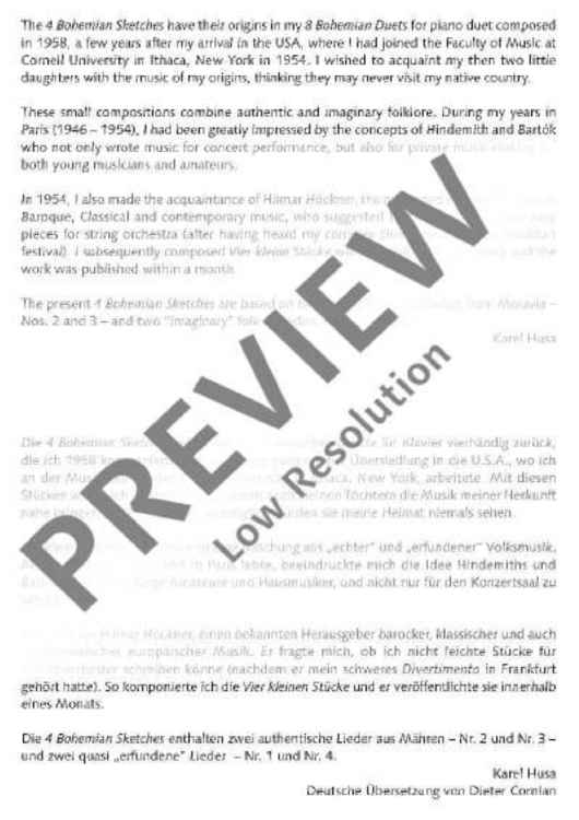 The '4 Bohemian Sketches' were originally composed as 8 Bohemian duos for piano duet (ED 4779). They are a mixture of 'real' and 'invented' folk music. With these pieces, Husa follows examples like Schumann, Hindemith and Bartok who also wrote music for young amateurs and those making music at home. They are music for playing in the best sense and can be used very early in instrumental lessons. Husa was born in Prague, studied with Arthur Honegger and Nadia Boulanger, among others, at the Paris Conservatoire and worked as a professor of music theory at the New York Cornell University in the USA for many years.