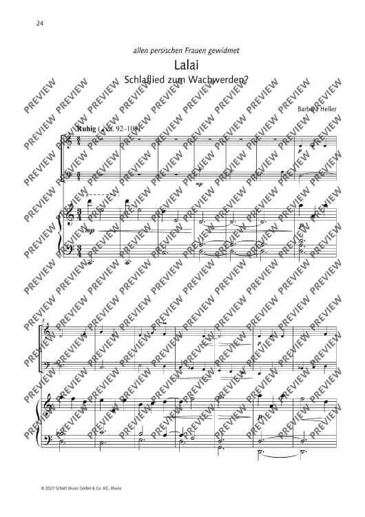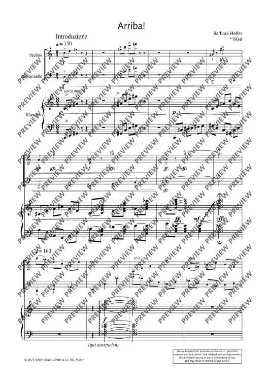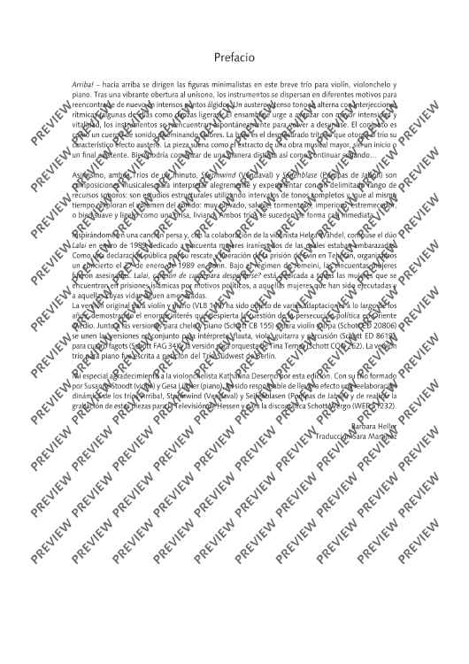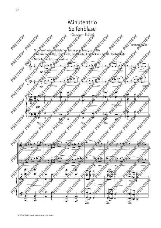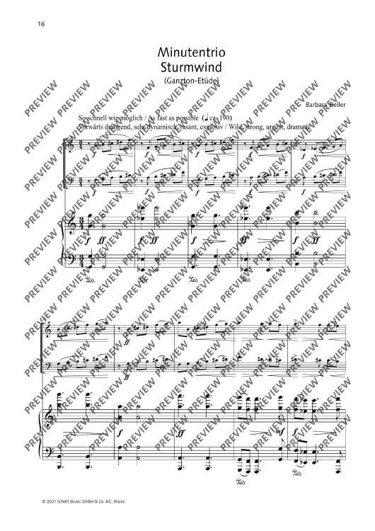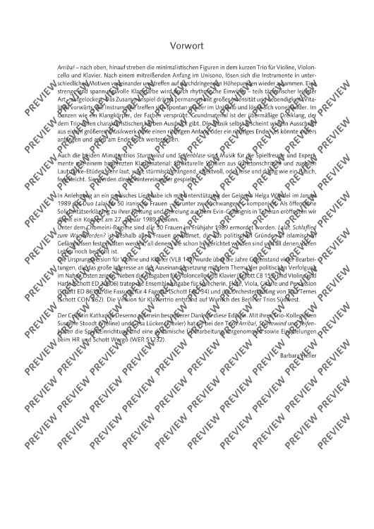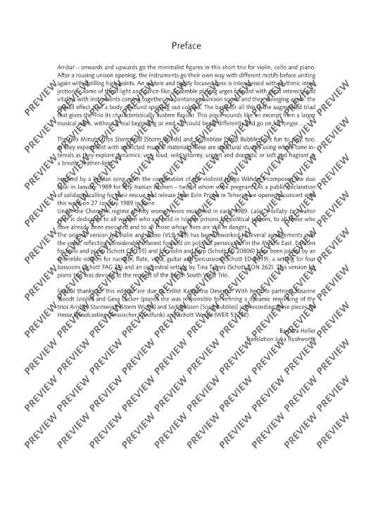 Each of Barbara Heller's trios has a different character. Whereas Arriba! comes along in a passionate and dance-like way, Lalai, composed on the basis of a Persian song, is a quite pensive piece. The two one-minute études Sturmwind and Seifenblase, differing in dynamics, are to be played one after the after. The trios Arriba!, Sturmwind and Seifenblase have been released on the CD Herbstmusik (WER 51232).