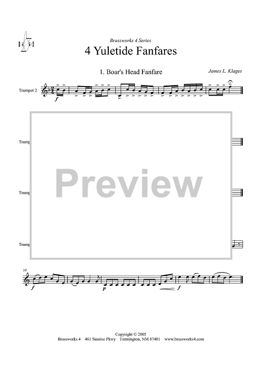 Digital Sheet Music for 4 Yuletide Fanfares - Trumpet 2 by James Klages scored for Trumpet Quartet; id:317224