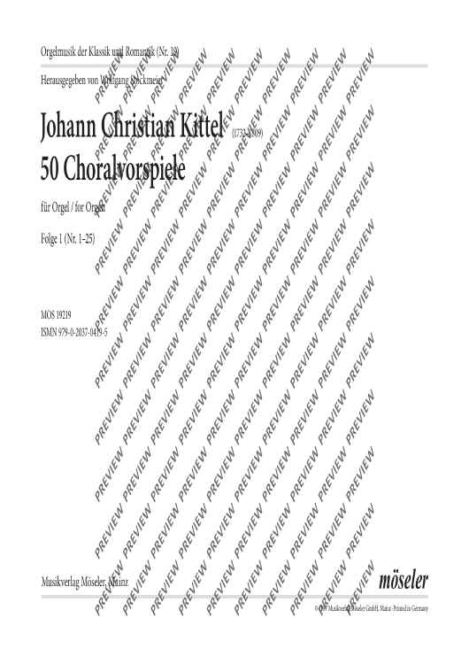 Digital Sheet Music for 50 chorale preludes by Johann Christian Kittel scored for Organ; id:504802