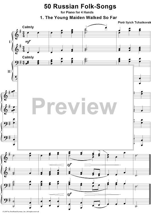 Digital Sheet Music for 50 Russian Folk-Songs. No. 1. The Young Maiden Walked So Far by Traditional, Peter Ilyich Tchaikovsky scored for 1 Piano, 4 Hands; id:364420