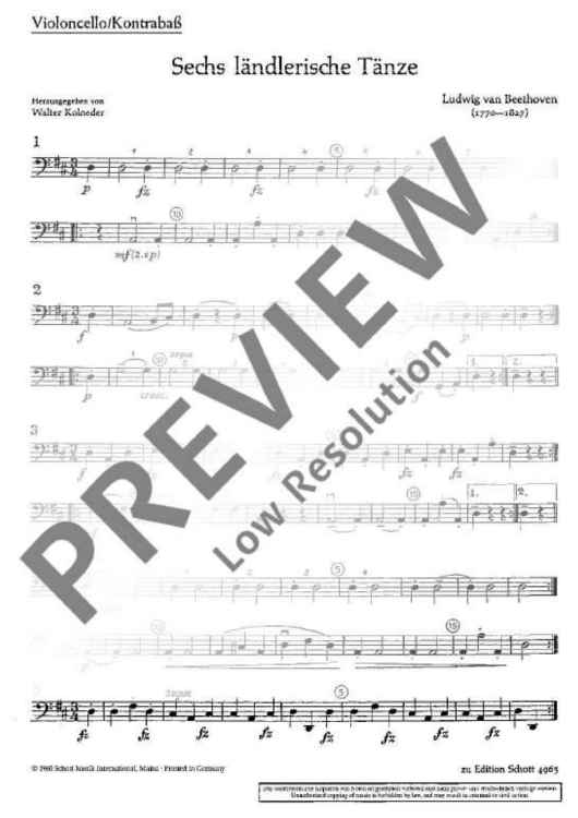 Not well-known are the numerous small pieces composed by Beethoven almost „on the side“ for musical use in everyday life. The „Ländlerische Tänze“ are intended to be -orchestral representing welcome playing ma-terial for small orchestras.