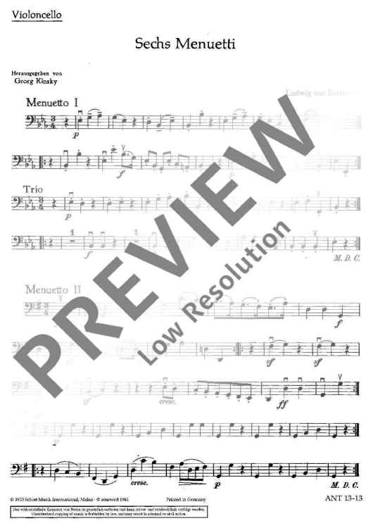 Digital Sheet Music for 6 Menuetti - Cello by Ludwig van Beethoven, Georg Kinsky scored for 2 Violins And Bass (violoncello), Piano Ad Libitum; id:480358