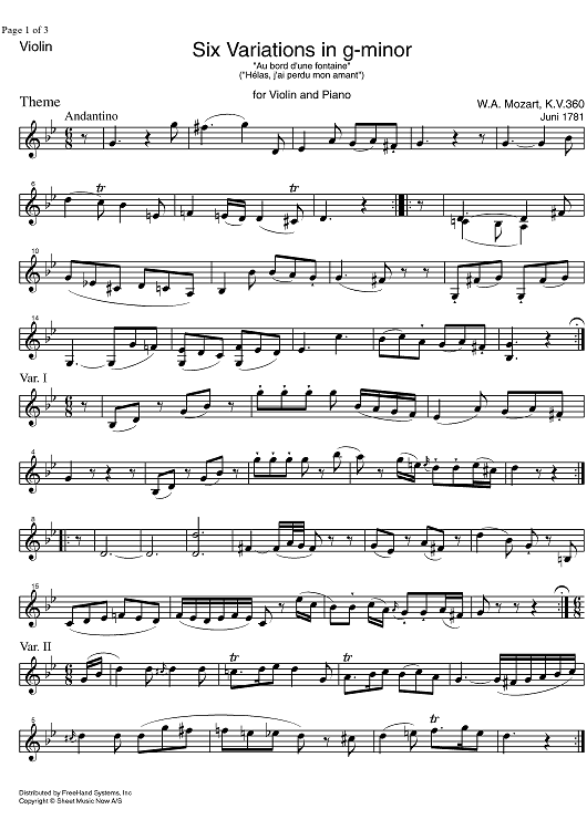 "6 Variations g minor KV360 - Violin" Sheet Music by Wolfgang Amadeus Mozart