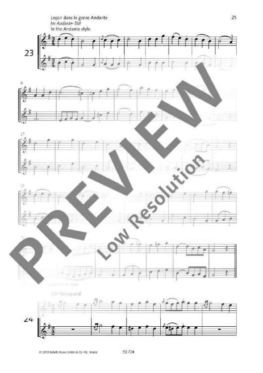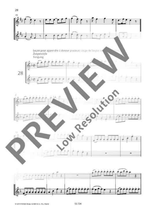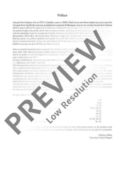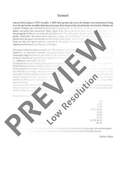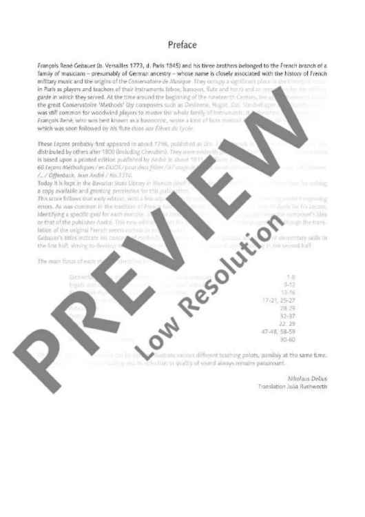 The French composer and bassoonist François René Gebauer (1773–1845) and his three brothers was closely tied to the history of French military music and the beginnings of the Conservatoire de Musique. As was customary at that time, the woodwind players also had complete command over other woodwind instruments, and therefore it comes as no surprise that Gebauer wrote a flute method – perhaps for his younger brother – which was soon followed by duos as well. '60 Methodical Lessons', first published in 1798, are entirely in the tradition of the French methods (Devienne, Hugot, etc.). Gebauer chose the form of duet and formulated headings for each exercise which make his idea of methodical steps clear: After elementary exercises in the beginning, the second half focusses on the development of the playing skills and an increasing understanding of music. The exercises cover a wide range from sound exercises via articulation and rhythm exercises to ornaments. A varied addition to the beginner's repertoire.