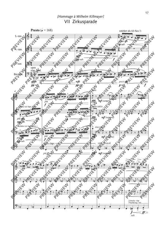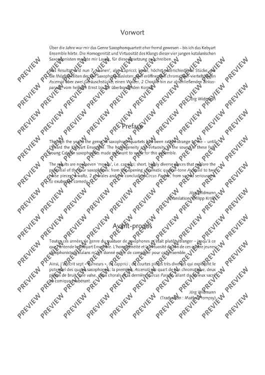 Über die Jahre war mir das Genre Saxophonquartett eher fremd gewesen – bis ich das Kebyart Ensemble hörte. Die Homogenität und Virtuosität des Klangs dieser vier jungen katalanischen Saxophonisten machte mir Laune, für diese Besetzung zu schreiben. Das Resultat sind nun 7 "Launen", also Capricci; kurze, höchst unterschiedliche Stücke, die die Möglichkeiten der vier Saxophone ausloten: vom eröffnenden chromatisch-vierteltönigen "Ascensió" über zwei Geräuschstücke, einen Walzer, 2 Choräle hin zur abschließenden "Zirkusparade", vom heiligen Ernst bis zur überbordenden Komik. - Jörg Widmann