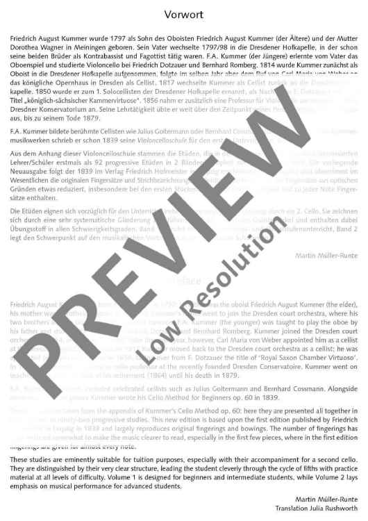 Die Etüden von Friedrich August Kummer eignen sich bestens für den Unterricht, insbesondere wegen der Begleitung durch ein 2. Cello. Sie zeichnen sich durch eine sehr systematische Gliederung aus, führen geschickt durch den Quintenzirkel und enthalten dabei Übungsstoff in allen Schwierigkeitsgraden. Ursprünglich stammen die Etüden aus dem Anhang von Kummers Celloschule für den ersten Unterricht op. 60. Diese Neuausgabe versammelt sie erstmals vollständig in zwei Bänden als 92 progressive Etüden. Sie folgt der 1839 erschienenen Erstausgabe (Verlag Friedrich Hofmeister, Leipzig) und übernimmt im Wesentlichen die originalen Fingersätze und Strichbezeichnungen. Zur besseren Lesbarkeit wurde die Zahl der Fingersätze leicht reduziert. Band 1 (ED 22371) wendet sich an den Anfangs- und Mittelstufenunterricht, Band 2 (ED 22372) legt den Schwerpunkt auf den musikalischen Vortrag des fortgeschrittenen Schülers. Friedrich August Kummer (1797–1879) war Schüler von Friedrich Dotzauer und Bernhard Romberg und bildete seinerseits berühmte Cellisten wie Julius Goltermann oder Bernhard Cossmann aus.