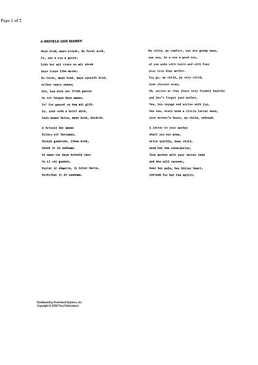Digital Sheet Music for A Brivele Der Mamen - Lyrics by , Velvel Pasternak, S. Shmulewitz scored for Any Klezmer instrumentation; id:343931