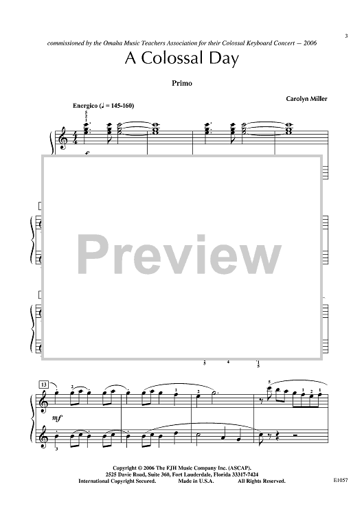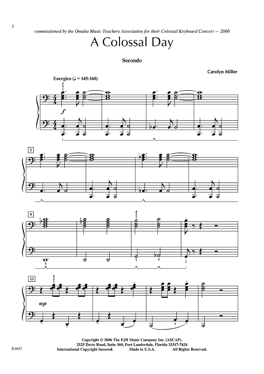The Omaha Music Teachers Association commissioned this energetic duet for their 2006 Colossal Keyboard Concert. Students will love the bouncy and cheerful melody, supported by the rhythmic accompaniment patterns of the secondo part.
