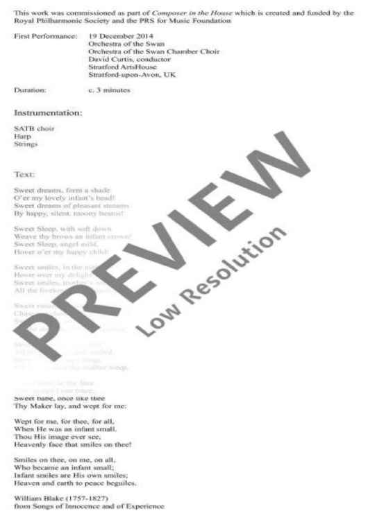 A setting of a text by William Blake from his collection of poems Songs of Innocence and Experience for SATB choir, harp and strings. The poem is a lullaby in which a mother hopes her sleeping baby's peace can proliferate to the rest of creation and is perfect for Christmas concerts. The work was written as part of Huw Watkin's Composer in the House residency with the Orchestra of the Swan in Stratford-upon-Avon.