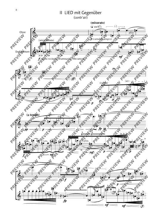 The piece combines four contrasting movements. For example, there is a recitativo drammatico, a frenzied labyrinth of sound, and a lament for Holliger's deceased sister and sister-in-law.